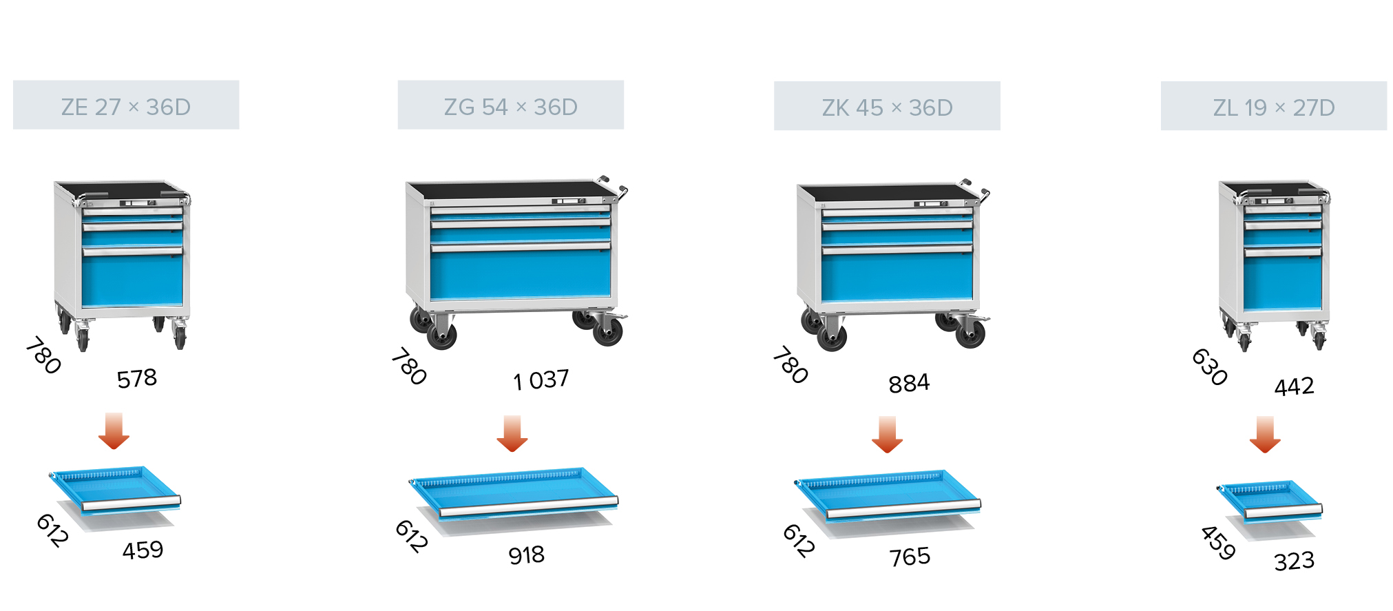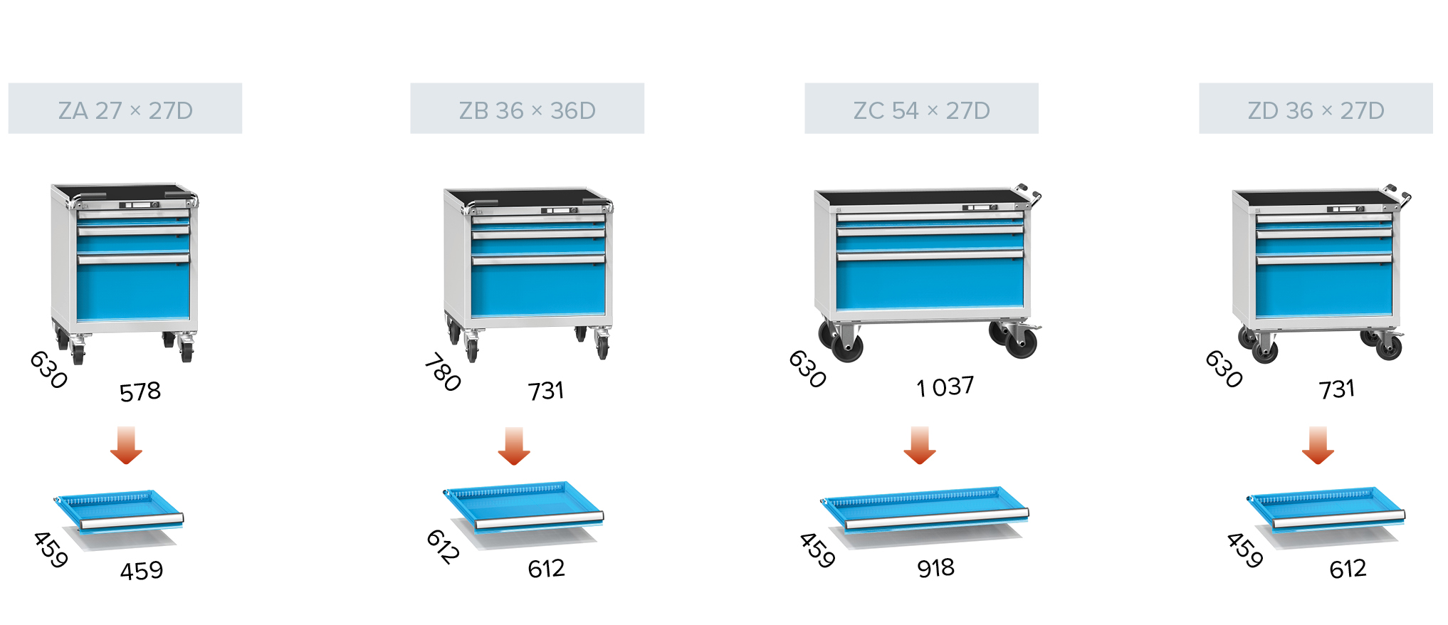 Pri výbere dielenského vozíka môžete vyberať medzi 8 pôdorysmi korpusov, z ktorých každý je v 6 výškach.