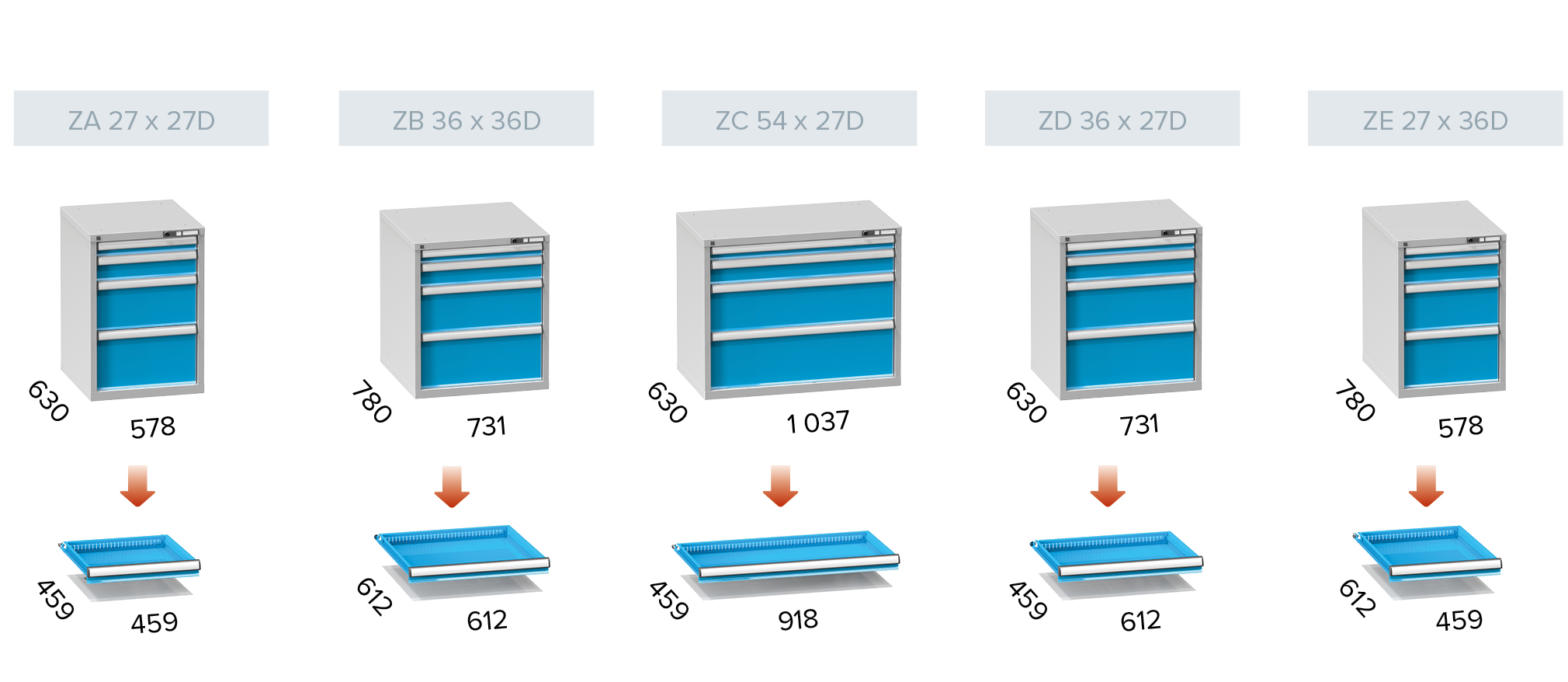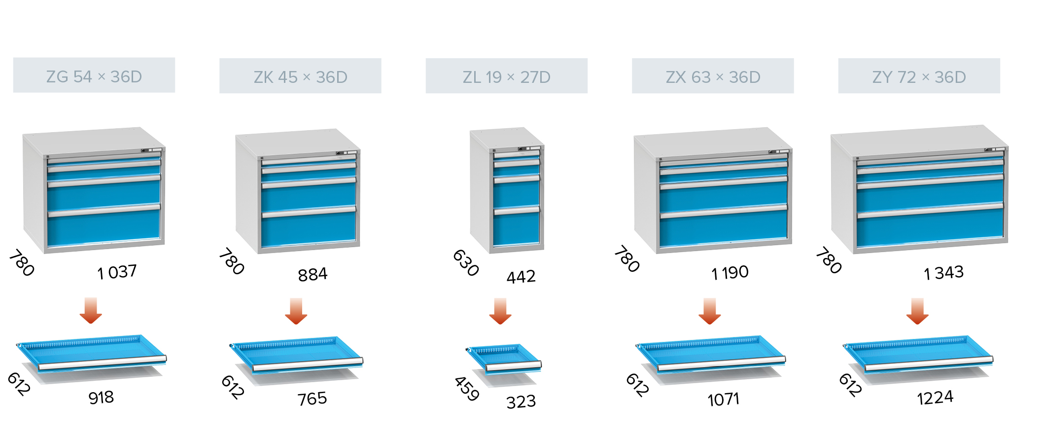 V ponuke nájdete aj zásuvkovú skriňu s výškou 190 mm, určenú výhradne na zavesenie pod pracovnú dosku. Dostupná je iba v pôdorysoch skríň ZA a ZB.